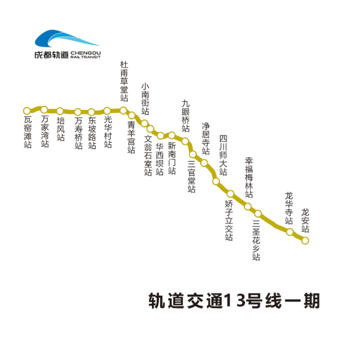 成都轨道交通13号线一期工程西起瓦窑滩站,东至龙安站。由西向东主要途经青羊区、武侯区、锦江区、龙泉驿区,一期设车站21座(均为地下车站),其中13座换乘站。