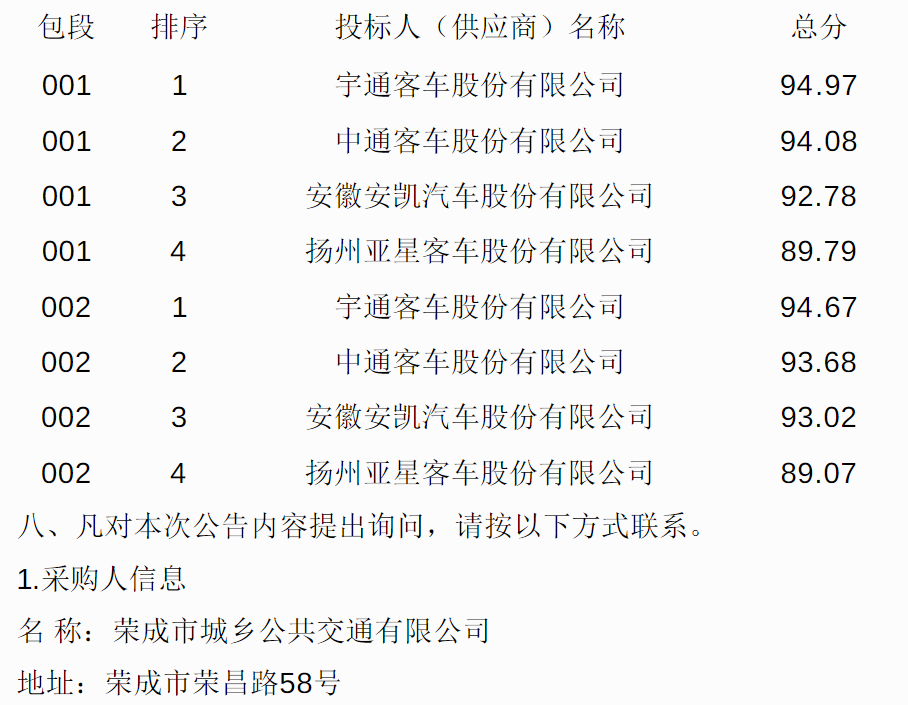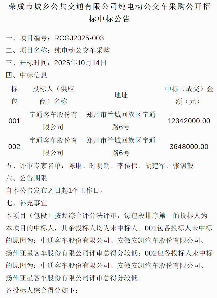 中标丨荣成市城乡公共交通有限公司纯电动公交车采购公开招标中标结果公告