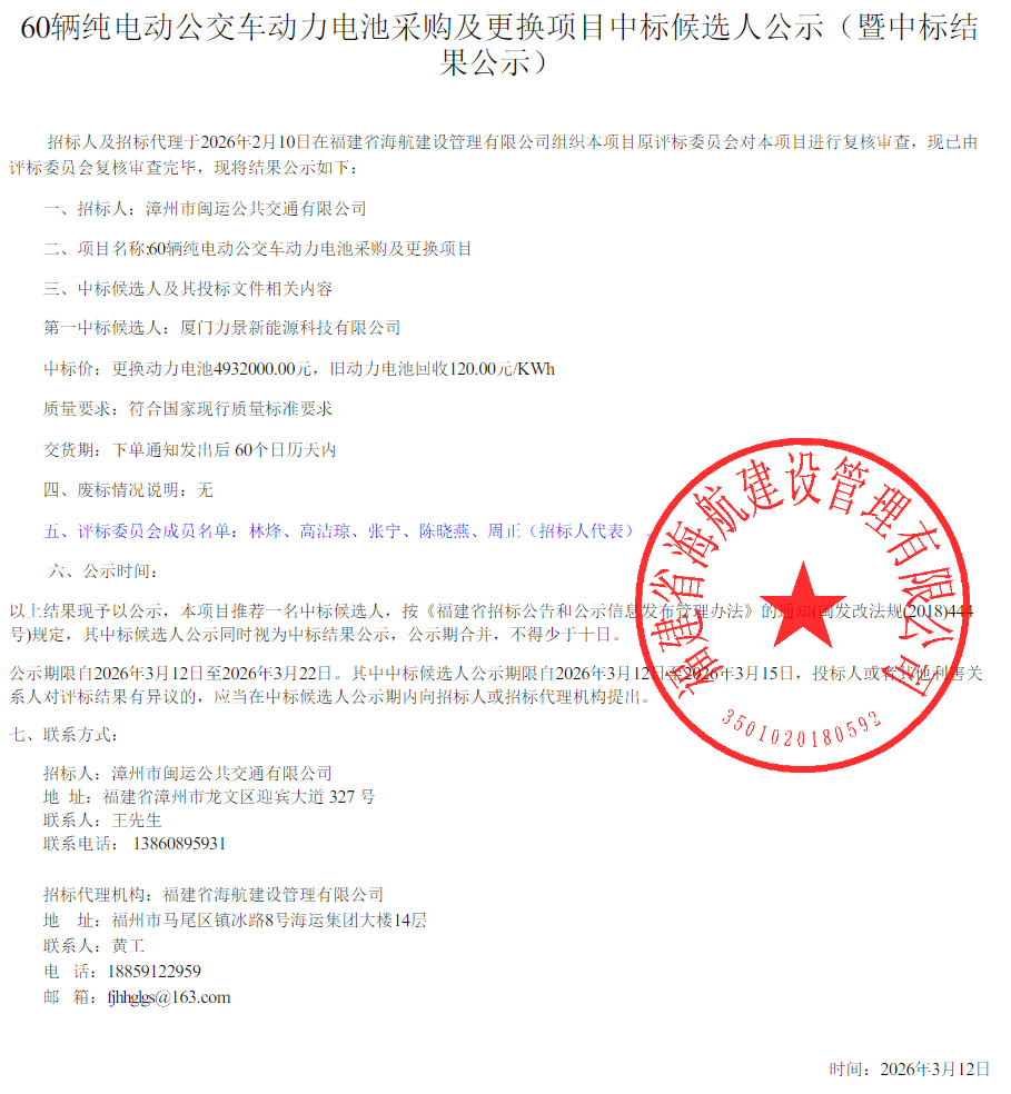 日前,60辆纯电动公交车动力电池采购及更换项目中标候选人公示(暨中标结果公示)。根据公告,该项目第一中标候选人:厦门力景新能源科技有限公司,中标价:更换动力电池4932000.00元。